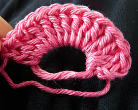 1.- 4. omg: 3 lm, hopp over 2 st, hekle en fm i neste st.